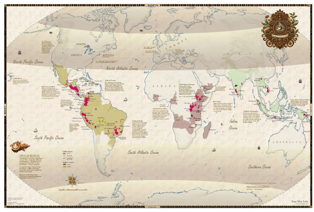 Our custom coffee maps delve into coffee-growing regions worldwide, illustrating the journey from bean to brew. With detailed depictions of coffee farms and processing methods, these maps celebrate the artistry of coffee production and connect drinkers to the rich history of their favorite beverage.